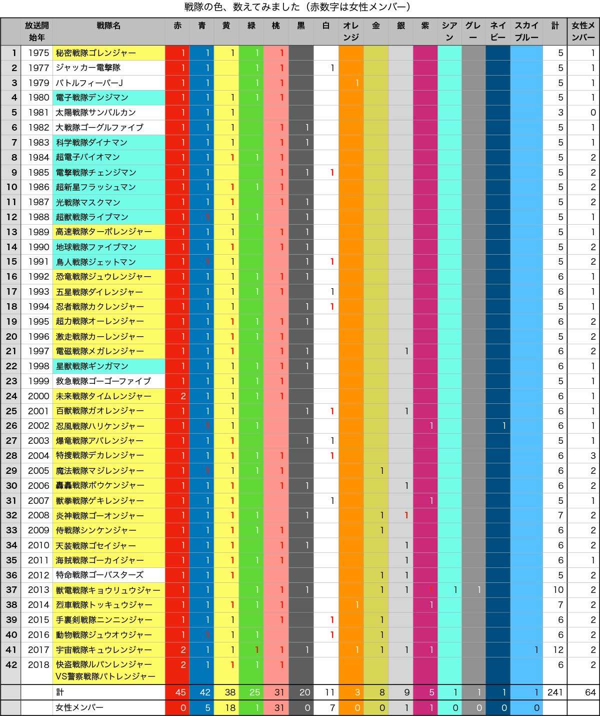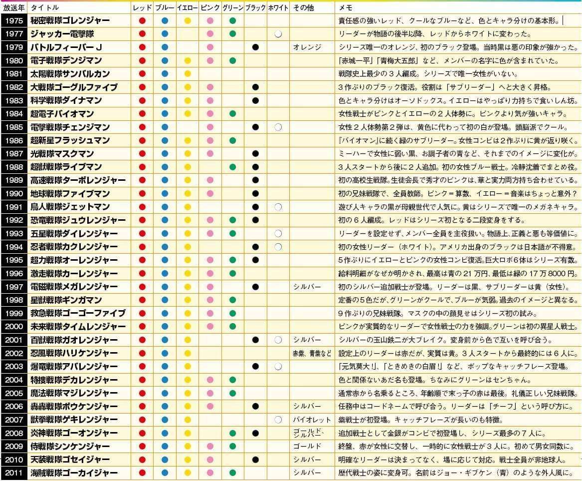 戦隊シリーズの初期から登場している基本となる色は赤、青、黄、桃、緑、黒、白、金、銀、紫、臙脂(赤紫)、紺(青紫)、水色、灰の15色で、初期メンバーの色はほとんどの場合が、この7色のいずれかです。