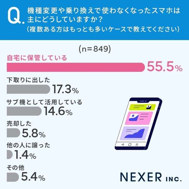 「自宅に保管している」(55.5%)と回答。以下、「下取りに出した」(17.3%)、「サブ機として活用している」(14.6%)が続きました。