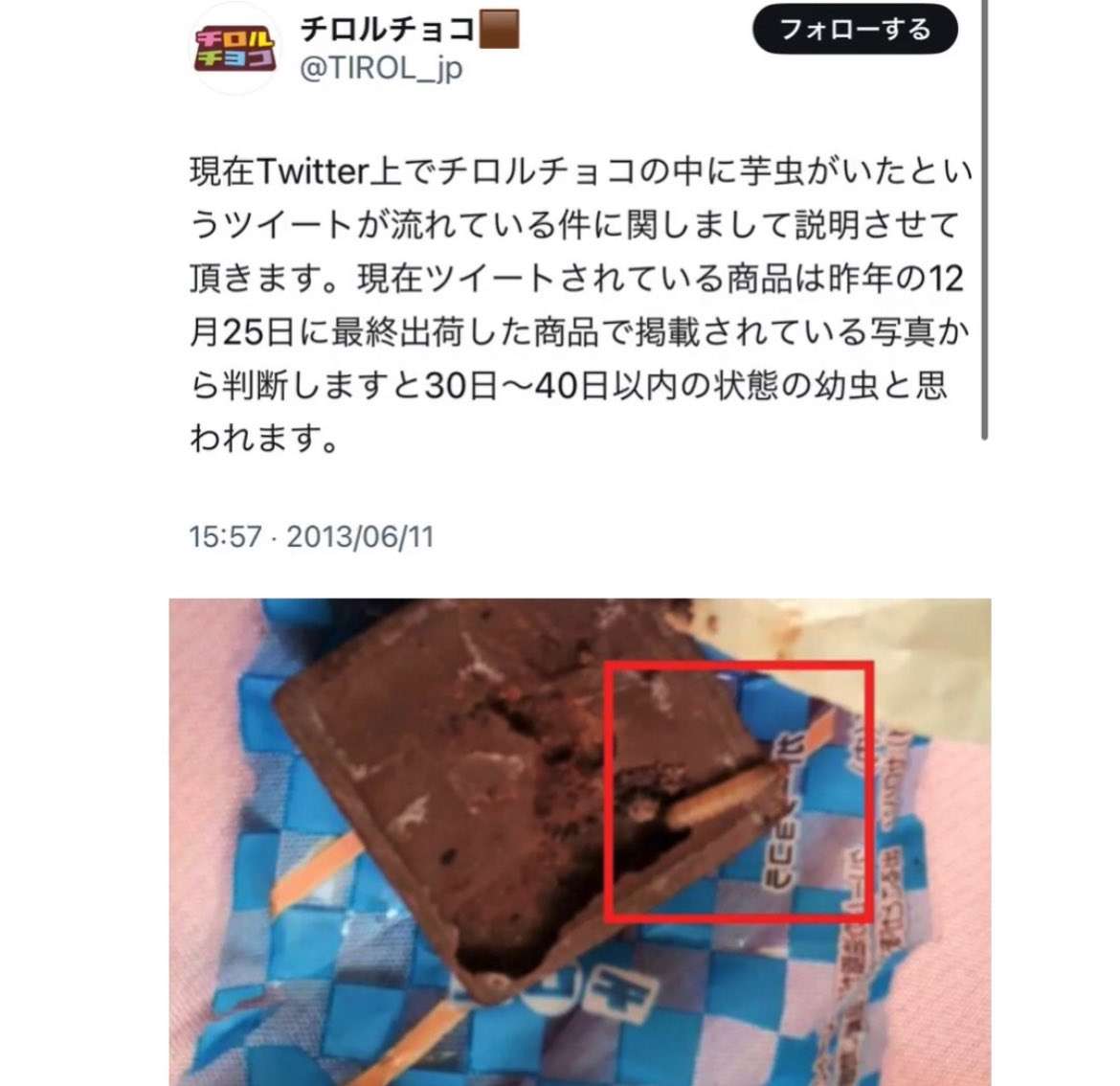 「チロルチョコに虫」投稿拡散→チロルチョコ「昨年以前に発売された商品と推察」「大変申し訳ございません」と謝罪