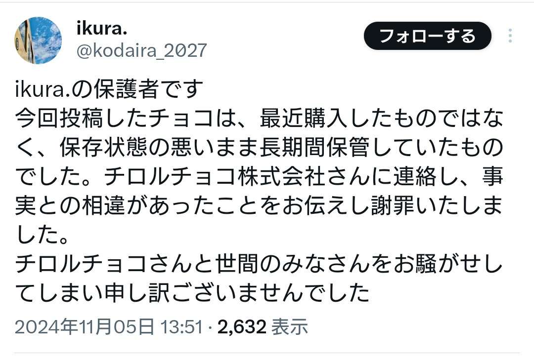 「いやぁ!最近買ったチロルチョコに虫が!!」→ チ「昨年発売した商品。どんな保管を?」→ 投稿主削除