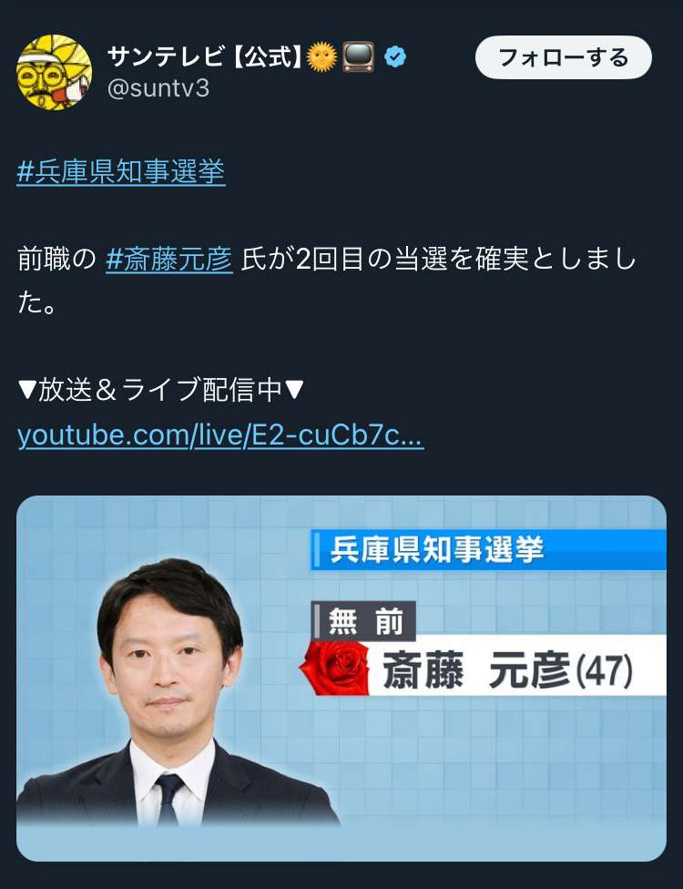 サンテレは公平に選挙運動を放送してたみたいですね。他の局は斉藤さんの放送をしなかったり不公平差もあったりしたようですが、今後はマスコミに惑わさられる時代も終わりです。