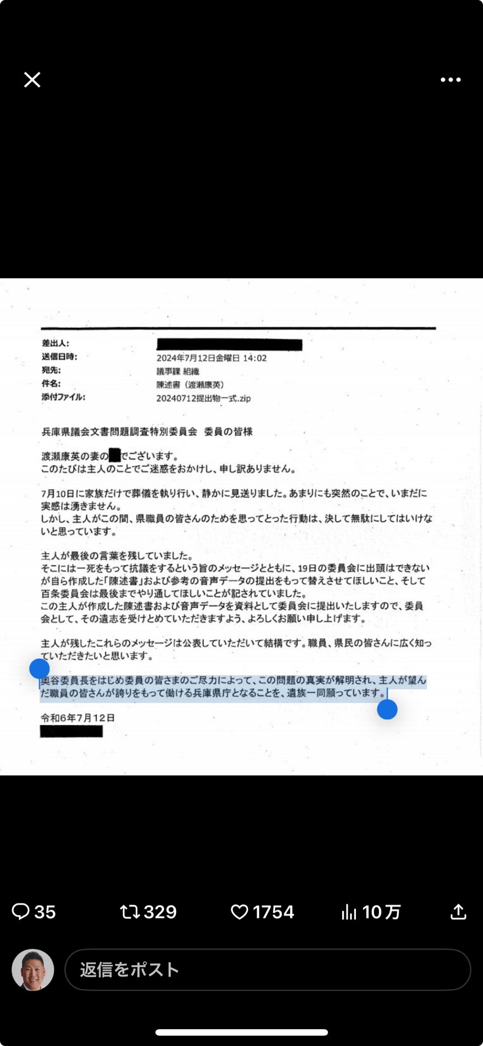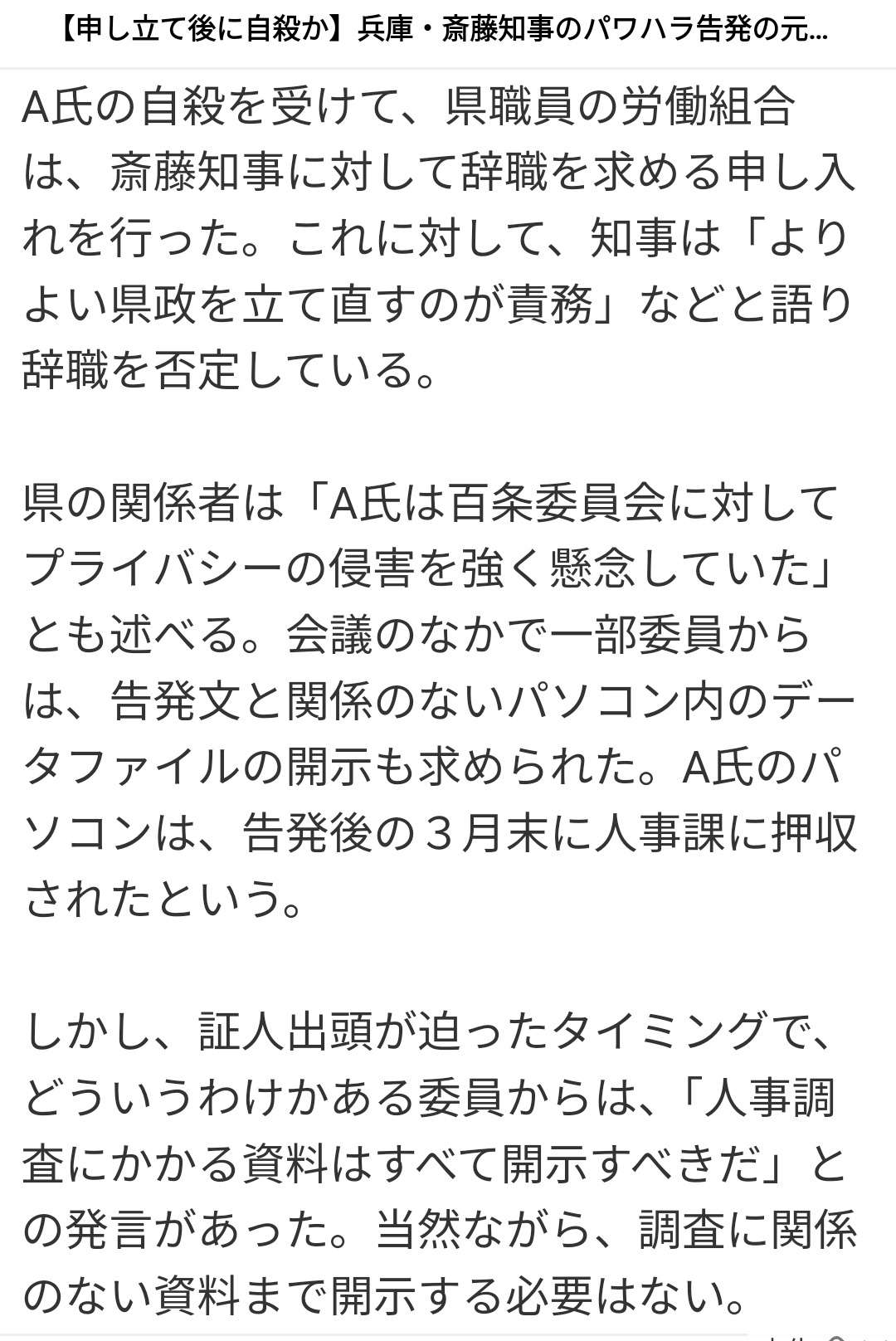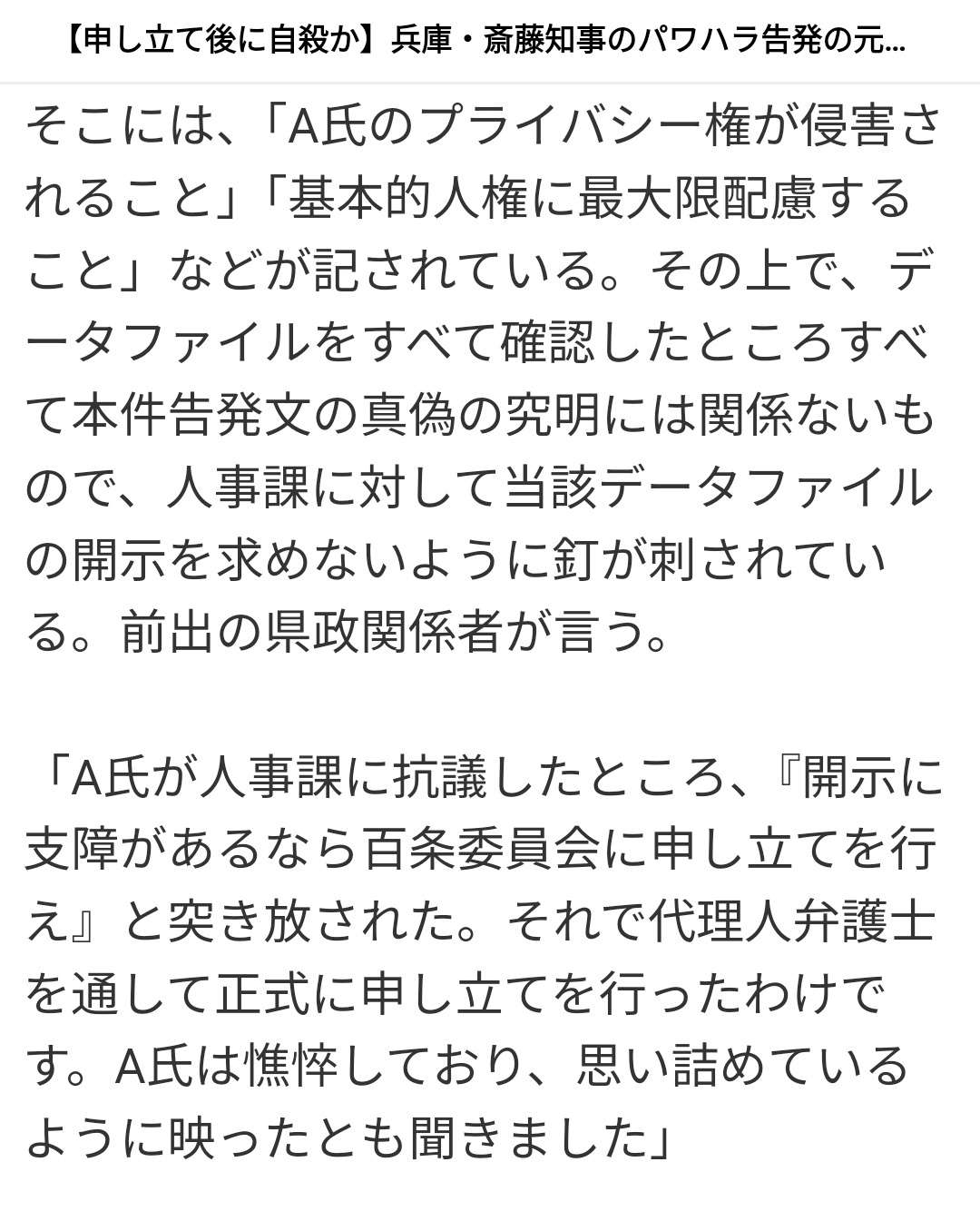 県民局長の代理人が百条委員会に公表しないで欲しいと申し入れの文書を提出した日の夜に自殺してるんだからそういうこと