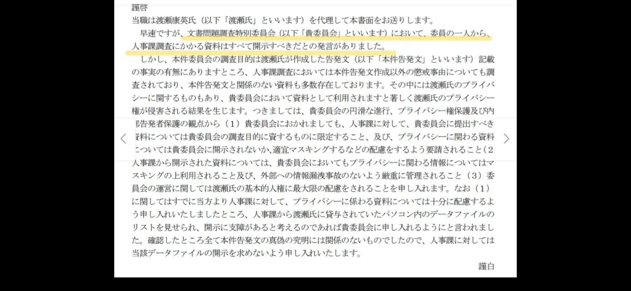 局長は局長代理人を通してパソコンの中身のプライベートな部分は関係ないので公開しないでくれと百条委員会に要求書を出していた
