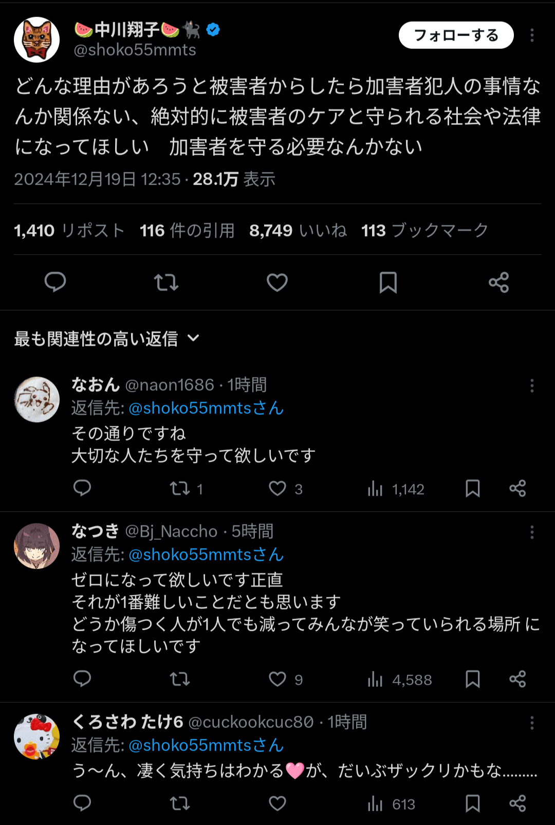 最後の一行に賛成で「加害者を消せ」みたいな返信だらけになってて笑えないわ