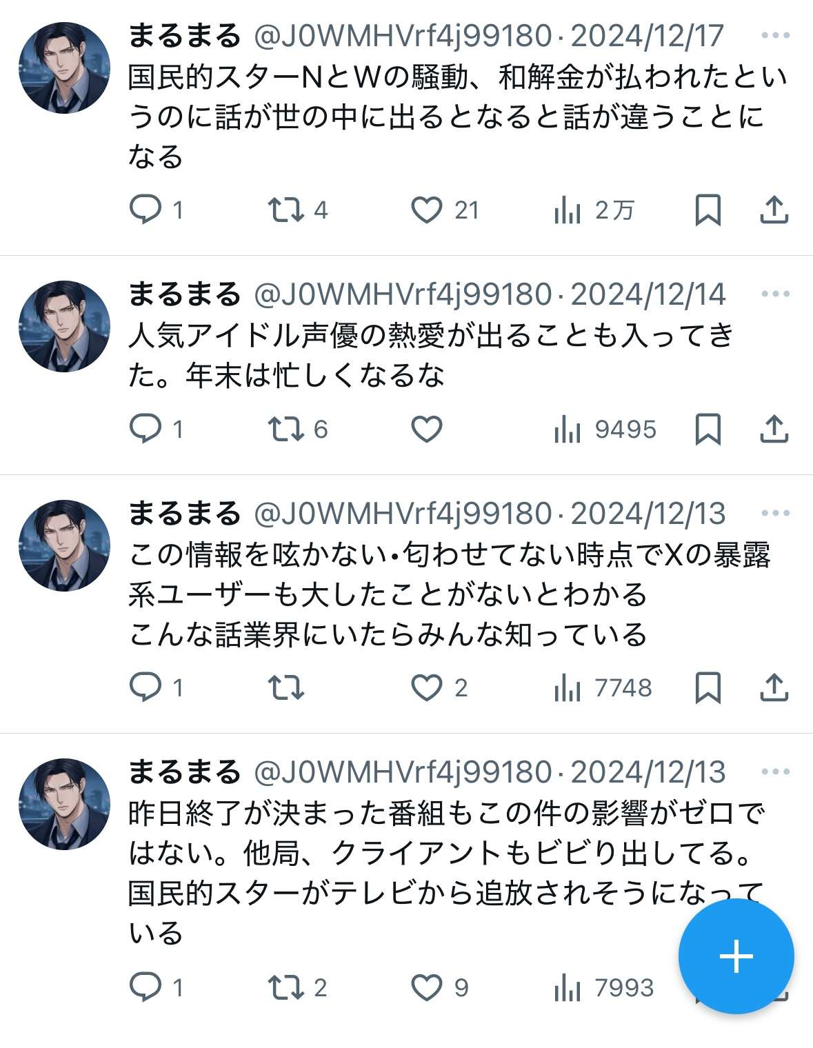 最初の記事が出たのが19日だけどそれ以前に匂わせてた人、相手のイニシャルもNとWで合ってた