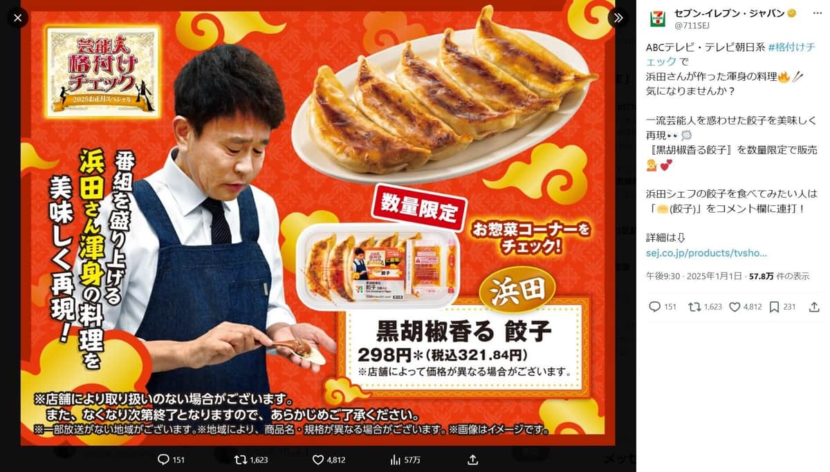 2025年の元日に放送された特別番組「芸能人格付けチェック! 2025お正月スペシャル」(ABCテレビ・テレビ朝日系)で、ダウンタウンの浜田雅功さんが手作りした中華メニューを全国のセブン-イレブンで期間限定発売するとの発表が注目を集めている。
