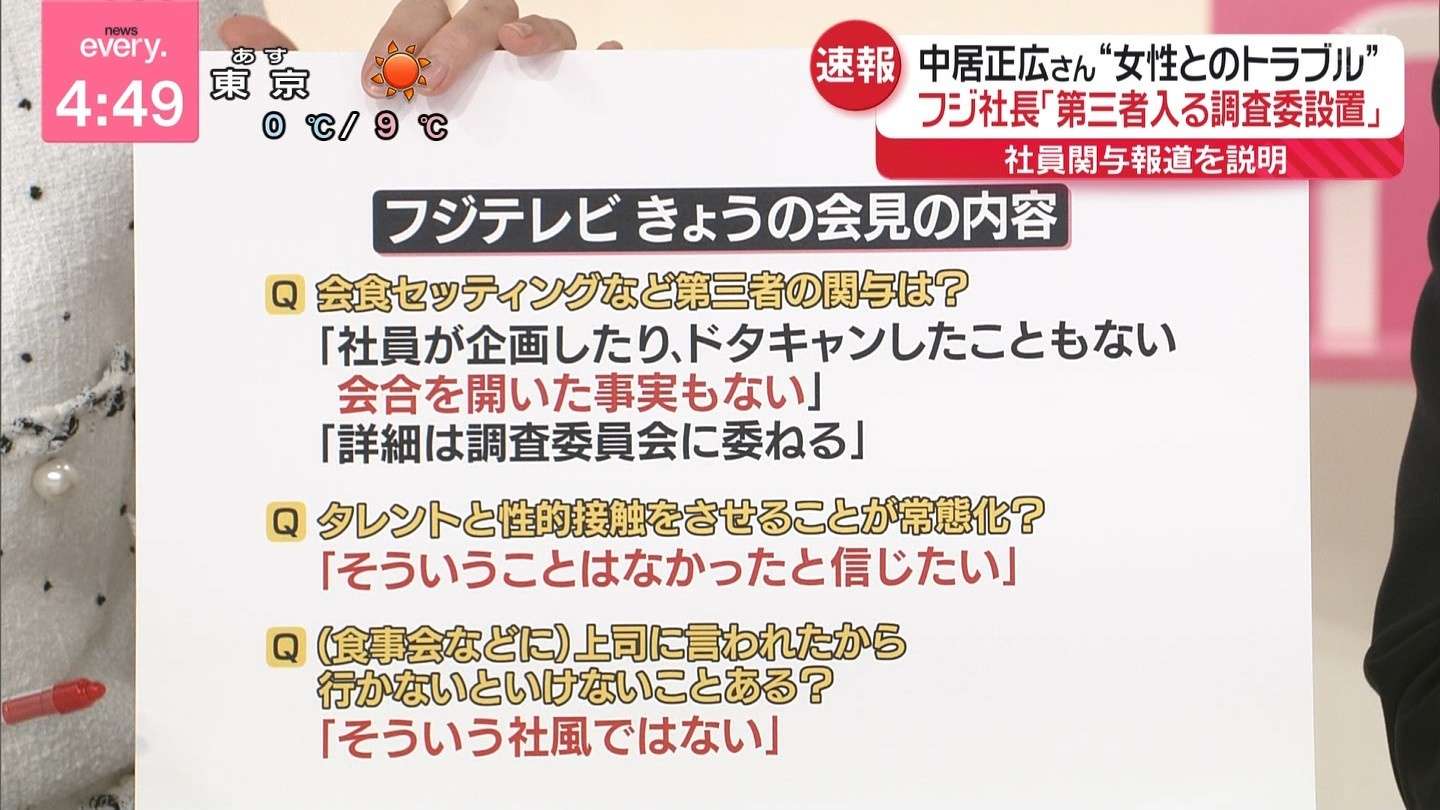 また、港社長自身が食事会に女性社員を同席させたと週刊誌に報じられたことについて、港社長は「通常番組制作や企業活動に伴って、出演者やプロダクションなど取引先と懇親の場を持つことはもちろんある」とした上で「わたくしも調査対象」として明確な回答を避けた。