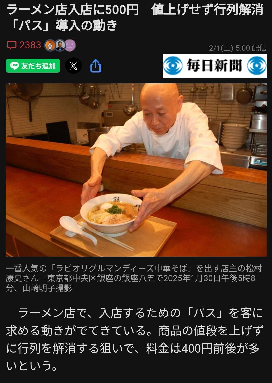 ラーメン店入店に500エン 値上げせず行列解消 「パス」導入の動き(毎日新聞)
