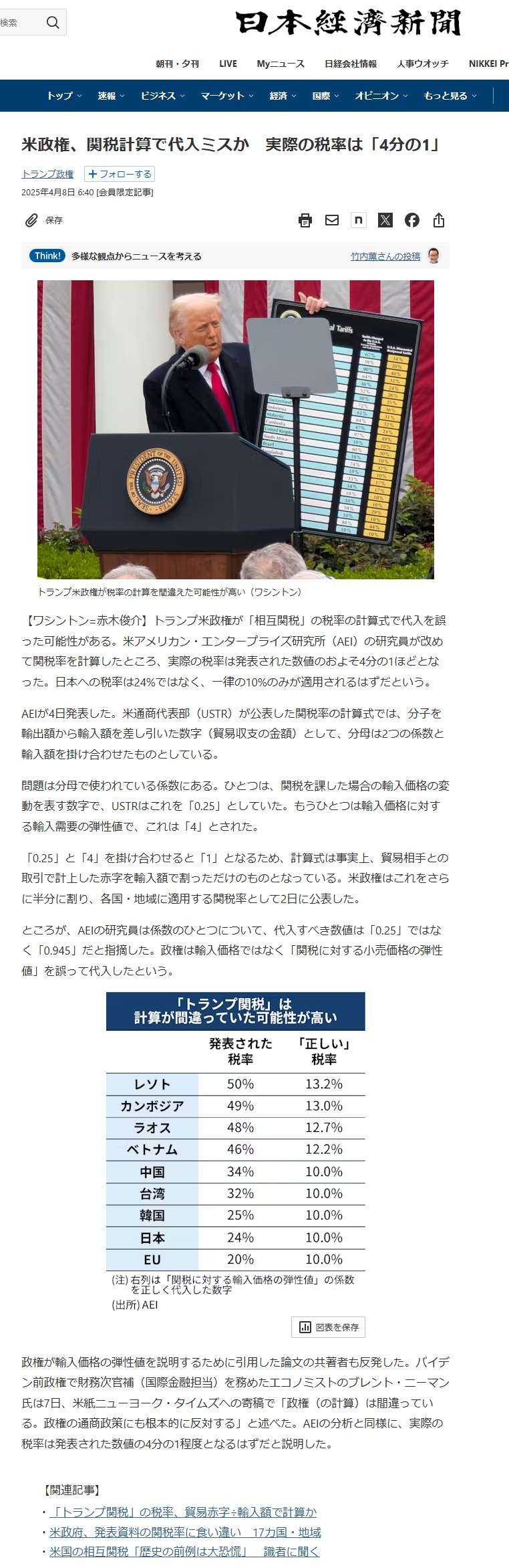 トランプ米政権が「相互関税」の税率の計算式で代入を誤った可能性がある。