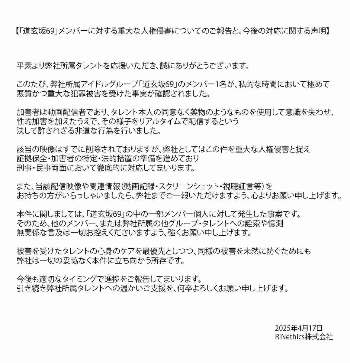 メンバーに対する「重大な人権侵害」が行われる事案が起きたことを報告し、民事・刑事両面で徹底的に対応するなどと表明した。
