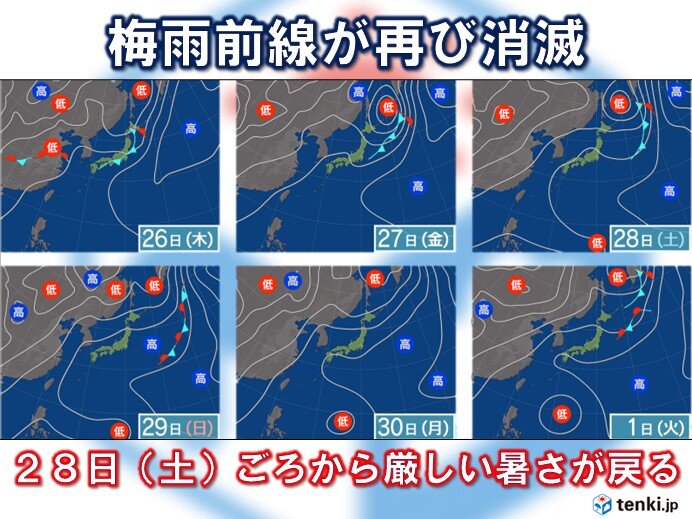 この先、日本列島にかかる梅雨前線が不明瞭となる見込みで、再び天気図から消滅する予想です。また晴れる日が多くなり、28日(...