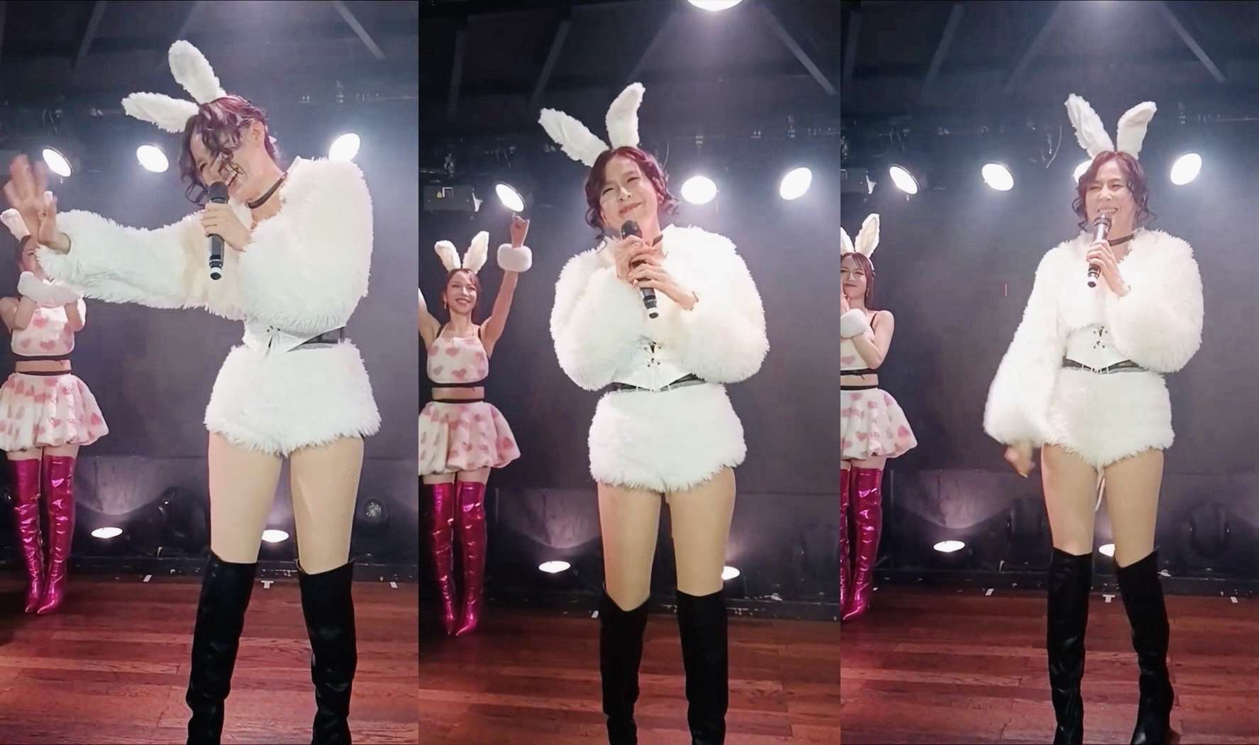 白いバニーガール衣装で美しい脚を披露し、「ファンの皆さんと共に過ごした新宿二丁目の夜は、