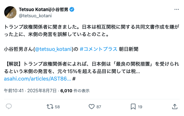 「最良の関税措置」を受けられるという米側の発言→日本側「ほな最高15%か」