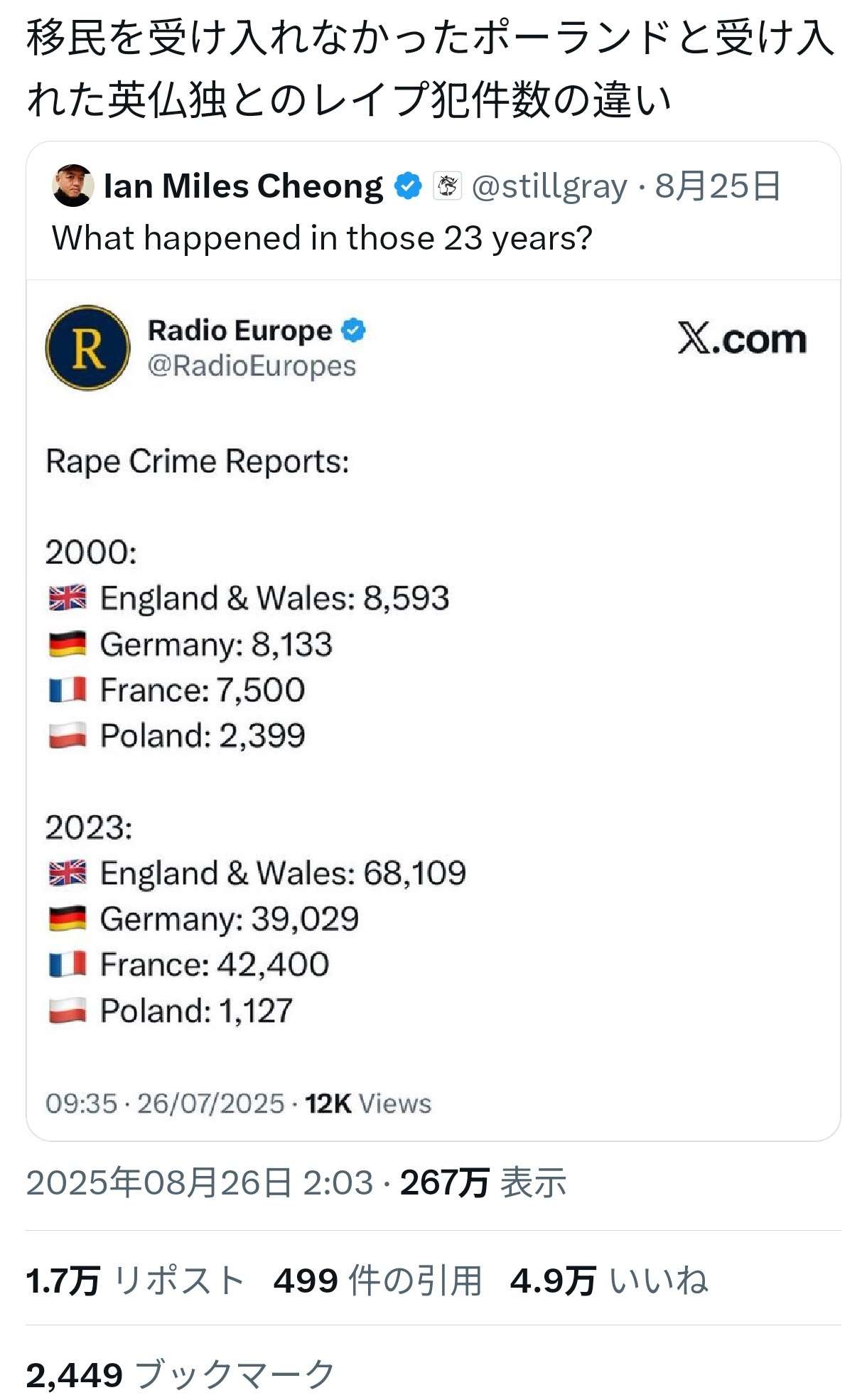 移民入れまくったヨーロッパ諸国と唯一移民を制限したポーランドのレイプ犯罪の差だ