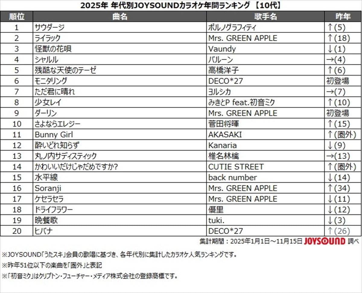 計期間は2025年1月1日~11月15日。ランキングは、選曲番号別ではなく、楽曲別として「本人映像」や「アニメカラオケ」などのオリジナルコンテンツも合算して集計。