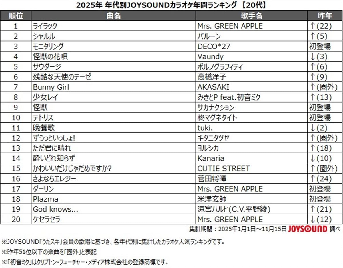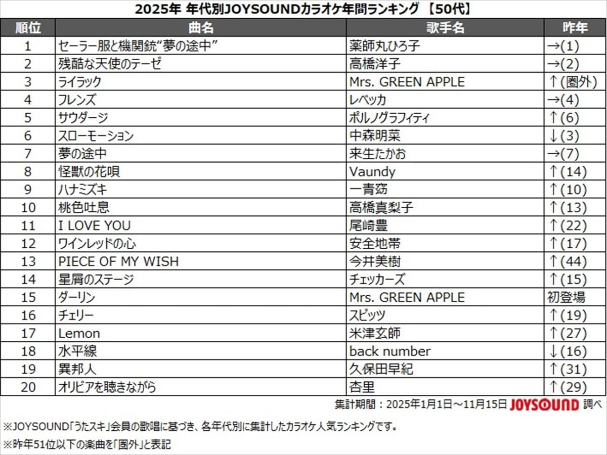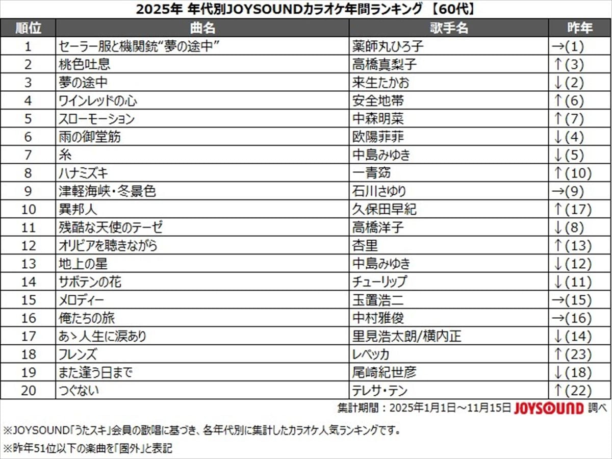 エクシング(名古屋市瑞穂区)が、JOYSOUNDが展開するカラオケ・ソーシャルメディア「うたスキ」の会員の歌唱に基づき、10代から60代の年代別にカラオケの人気曲を集計した「2025年 年代別カラオケ年間ランキング」を紹介しています。