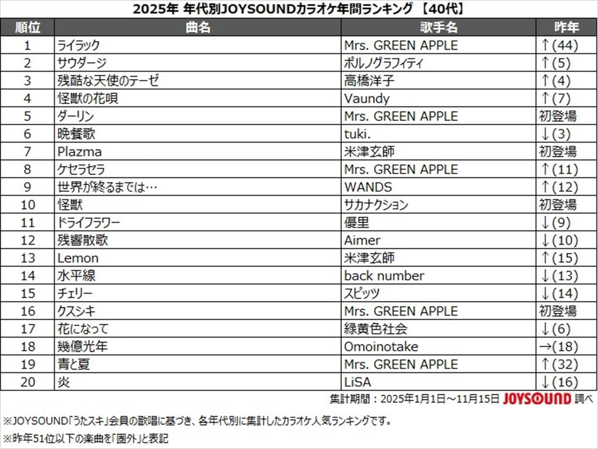 10代の1位は、バンド「ポルノグラフィティ」が2001年に発表したヒット曲「サウダージ」でした。20代、30代、40代の1位はバンド「Mrs. GREEN APPLE」の人気曲「ライラック」という結果でした。