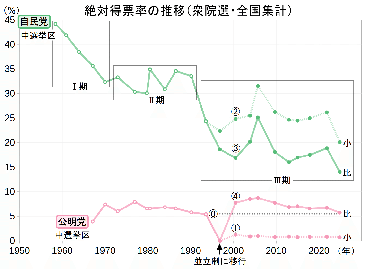 【悲報】自民党、公明党無しだと小選挙区の得票数が25%ダウンする