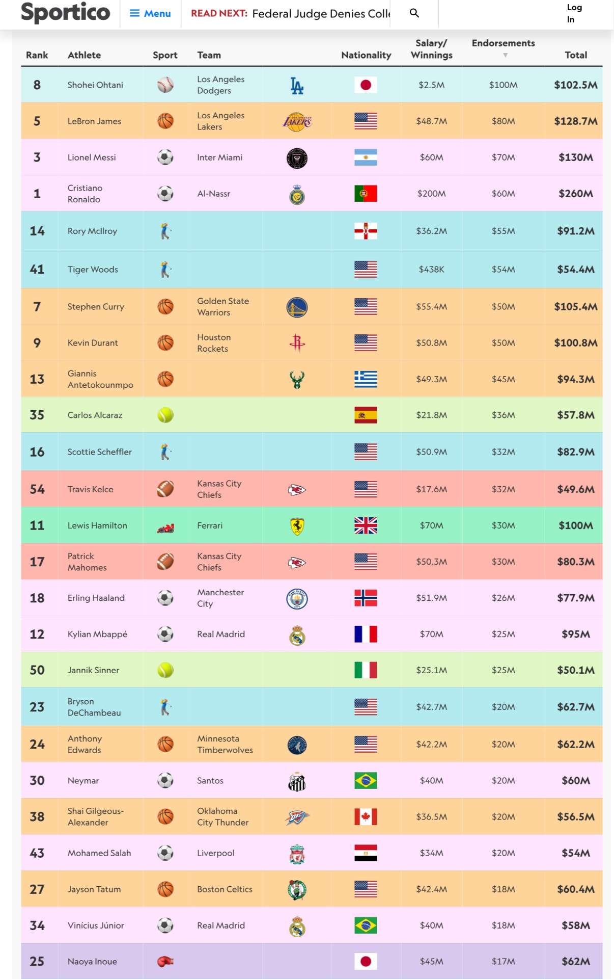 1位 大谷翔平 ⚾ 1億ドル(158億円)