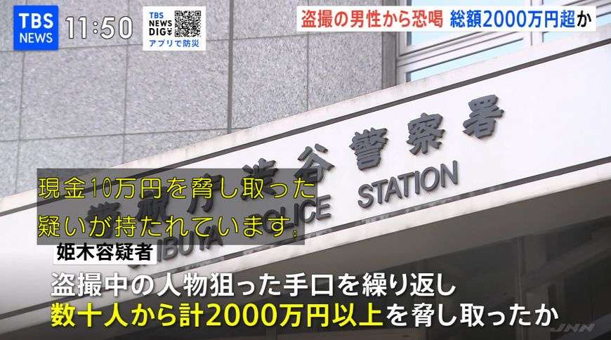 姫木容疑者は容疑を否認していますが、警視庁によりますと、姫木容疑者は盗撮中の人物を狙った同様の犯行を繰り返し、数十人からあわせて2000万円以上を脅し取ったとみられるということです。