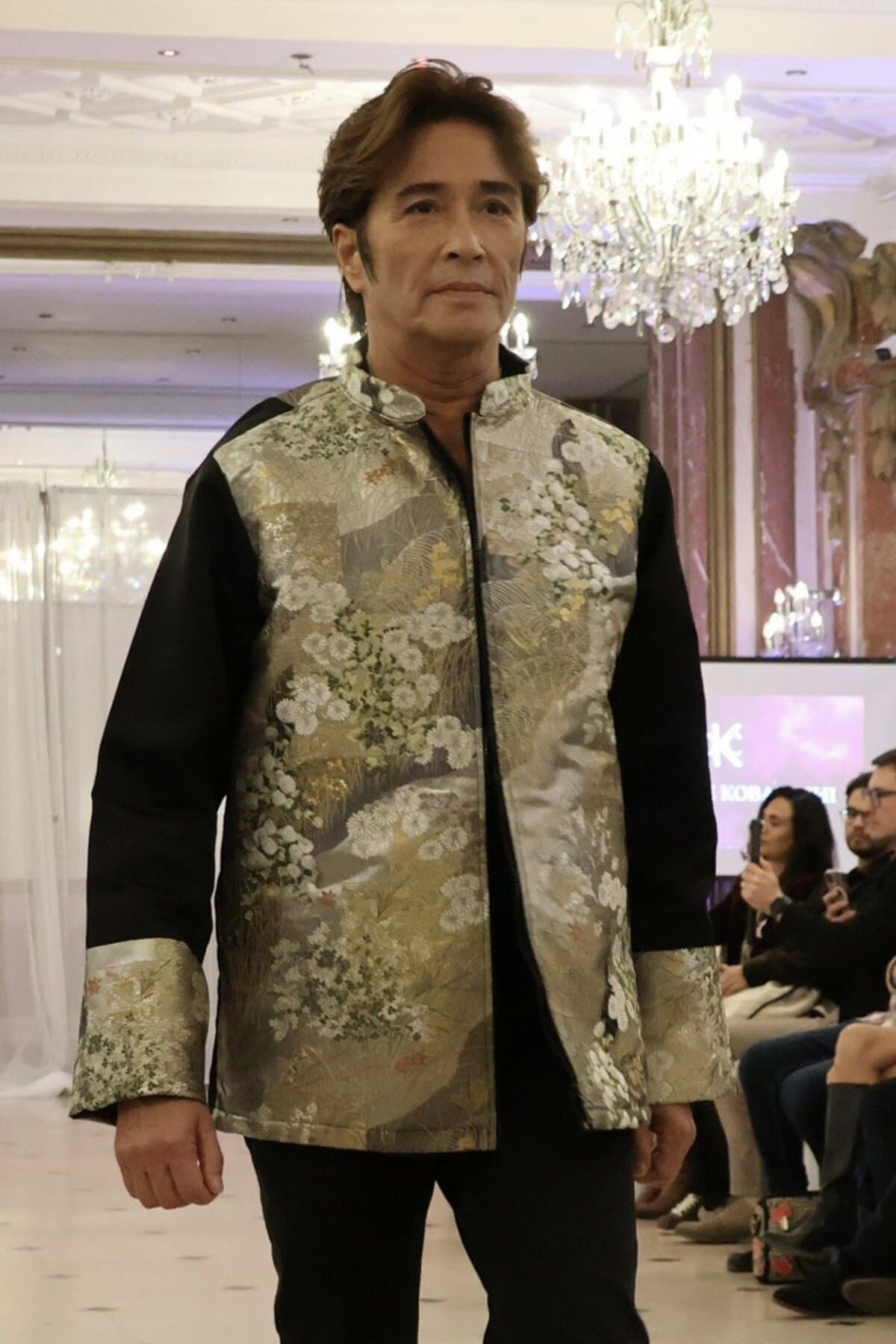 今回は、着物を再利用したサステナブルファッションで注目されている新進デザイナー・Marjorie Resuello‐Kobayashi(マージョリー・コバヤシ)の作品を纏った。着物の和柄の入ったジャケットが映える。