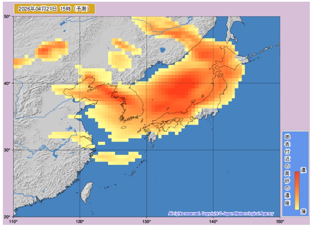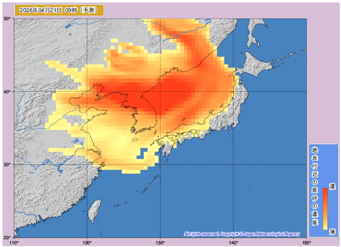 「地表付近の黄砂の濃度」を示した気象庁の黄砂解析予測図では、特に21日(火)午前から22日(水)夜にかけて、濃い黄砂が飛来する予測となっています。