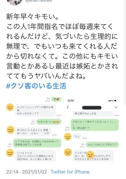 新年早々キモい。この人1年間指名でほぼ毎週来てくれるんだけど、気づいたら生理的に無理で、でもいつも来てくれる人だから切れなくて。この他にもキモい言動とかあるし最近は嫉妬とかされててもうヤバいんだよね。